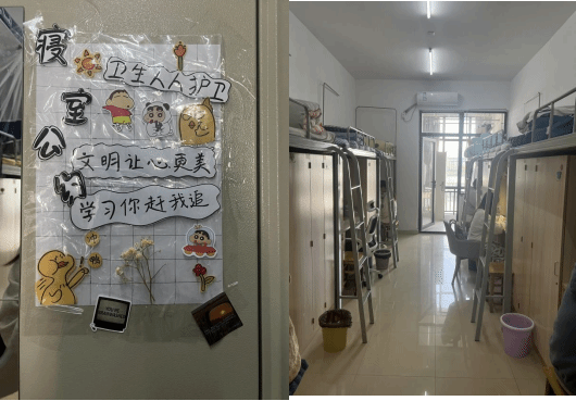 宿舍装扮展示。每间宿舍不仅地面干净明亮、物品摆放有序,而且展现出具有宿舍文化特征的创意宿舍公约、安全提示等……良好的宿舍气氛展现出同学们以校为家的情感,彰显了太阳集团tyc33455学子热爱生活,良好的精神风貌。