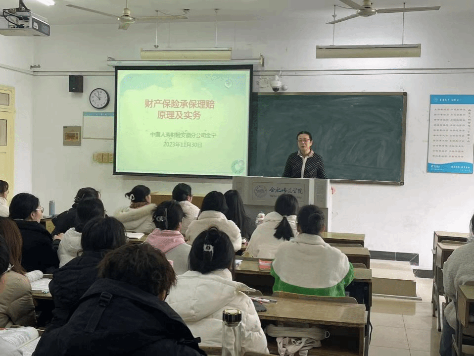 为进一步深化人才培养模式改革,推进校企合作和产教融合,促进学院应用型人才培养高质量发展,全面提升学生应用能力, 11月30日上午,太阳集团tyc33455邀请中国人寿财险安徽省分公司高级专员金宁为2021级金融工程专业学生讲授《保险学原理》课程。