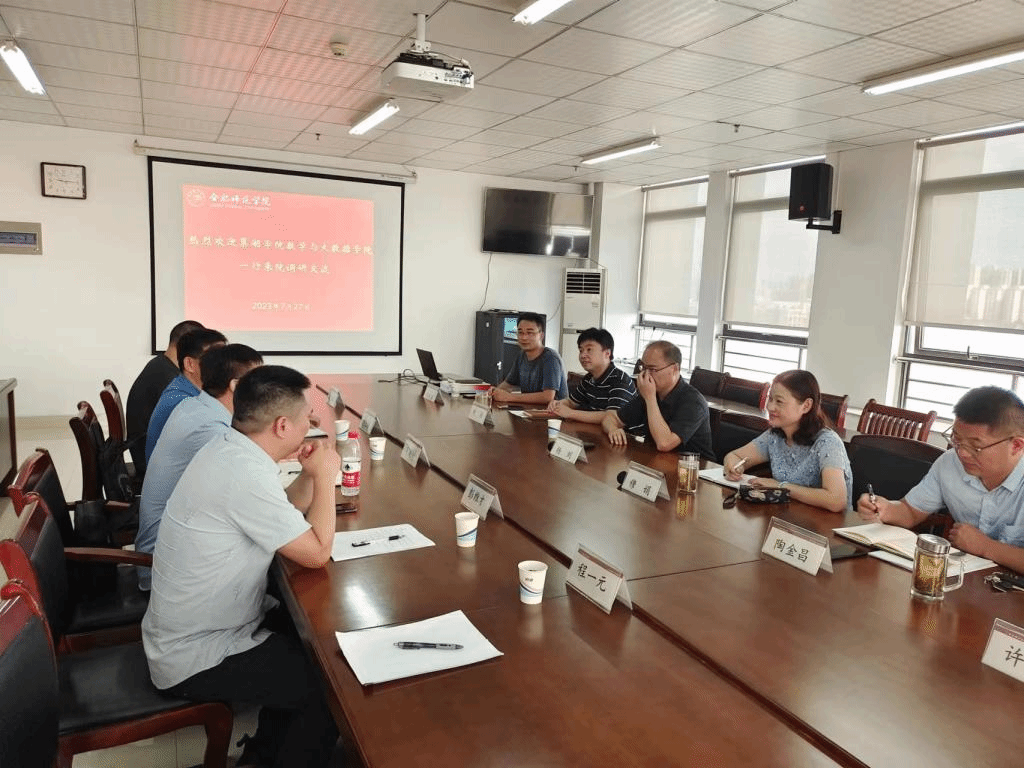 本网讯 7月27日,巢湖学院数学与大数据学院副院长陈佩树、副书记郝江锋、副院长彭维才、应用数学系主任徐富强、数学与应用数学教研室主任程一元一行5人来太阳集团tyc33455开展调研交流。学院党委书记穆娟、副院长杨刘、副书记陶金昌、副院长黄浩、数学系主任许和乾、金融系主任齐继兵出席交流会。