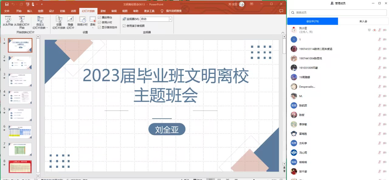 6月13日,学院召开毕业生文明离校线上主题班会,毕业班辅导员详细介绍毕业生离校相关事宜及注意事项,对党团组织关系转接、助学贷款确认、医保报销等注意事项进行了提醒,要求同学们高度重视毕业离校相关事务办理,为安全有序离校提前做好准备。希望全体毕业生文明离校、遵守校纪校规,离校前能主动打扫干净宿舍、主动归还相关物品、注意自身健康和出行安全,为师弟师妹们做榜样。最后,动员未就业学生积极主动就业,树立先就业后择业的观念。