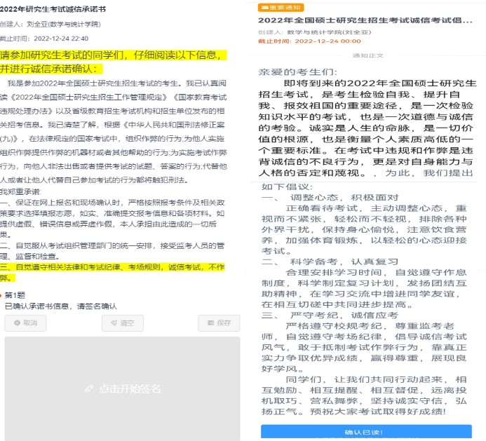 本网讯 为切实增强学生遵纪守法、诚信考试的意识,维护研究生考试的公正性和严肃性,太阳集团tyc33455开展2023年研究生考试诚信教育活动。