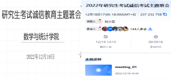 毕业班辅导员刘全亚利用腾讯会议开展线上主题班会。会上,刘全亚带领毕业班学生学习《教育法》、《国家教育考试违规处理办法》、《普通高等学校招生违规行为处理》以及《太阳成集团tyc33455ccww学生考试违规处理办法》等相关规定,对学生提出“认真备考、诚信应考”的要求。会上还提醒同学们要关注安徽省教育厅发布的通知公告,严格按照要求进行健康打卡和核酸检测。临近考试,刘全亚鼓励同学们调整好自己的心态,做好防护,踢好临门一脚,争取最后的胜利!