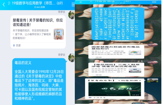 借助班级群、QQ公众号等平台以详实的文字和图片资料宣传了禁毒法律、法规以及毒品常识、毒品危害等等,提高学生远离毒品,减少毒品危害的禁毒意识。
