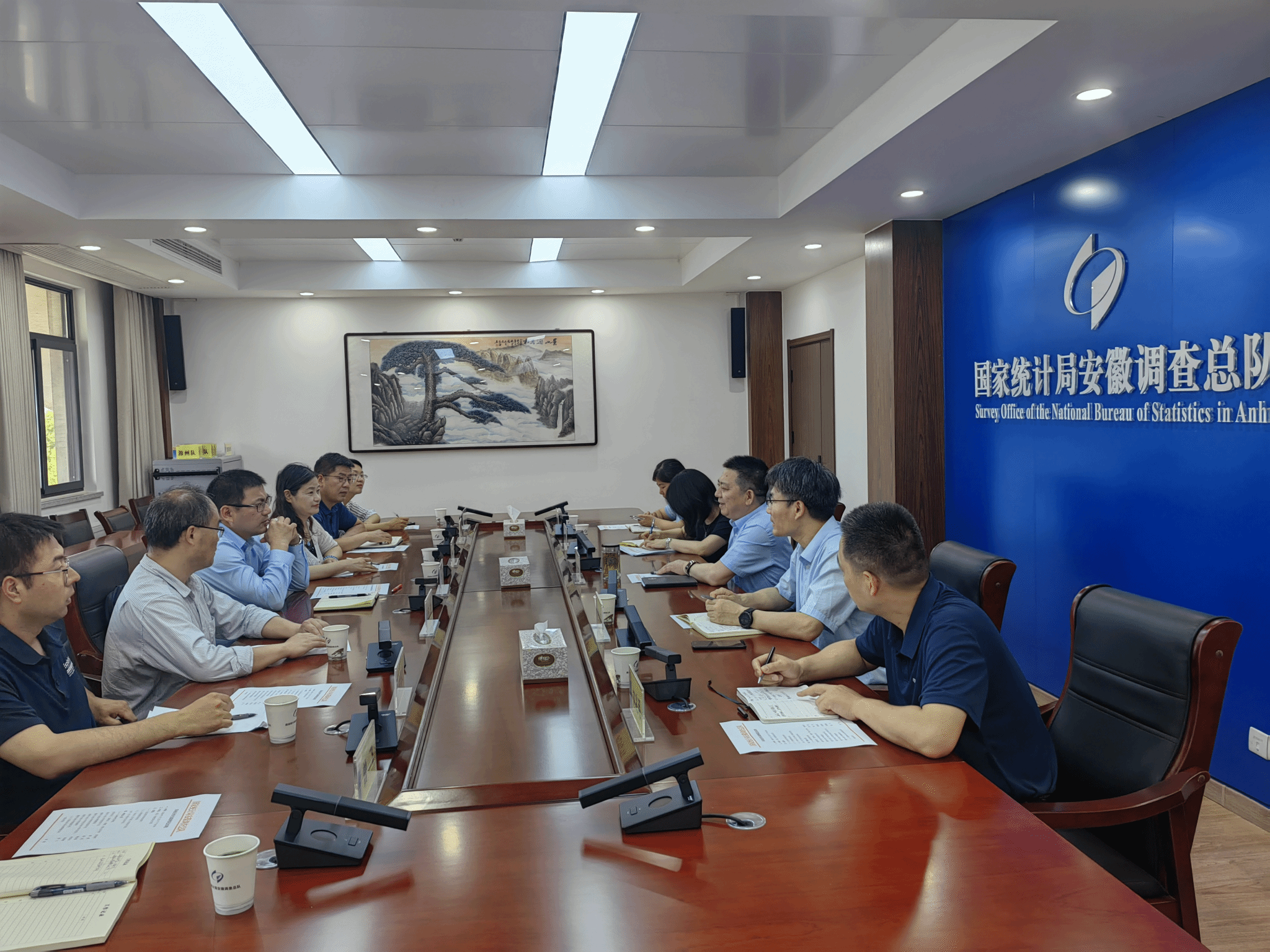 国家统计局安徽调查总队一级巡视员章勤、办公室主任张尚豪、综合处副处长孙悦等接待了周端明一行,对周端明一行到来表示热烈欢迎,并介绍了国家统计局安徽调查总队总体情况。