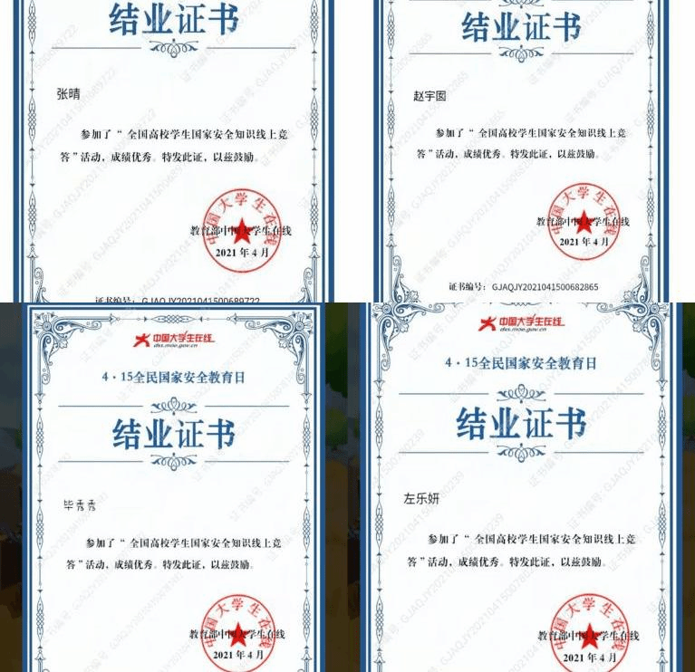 我院全体学生参加“全国高校学生国家安全知识线上竞答”,并获取中国大学生在线公众号颁发的学习证书。