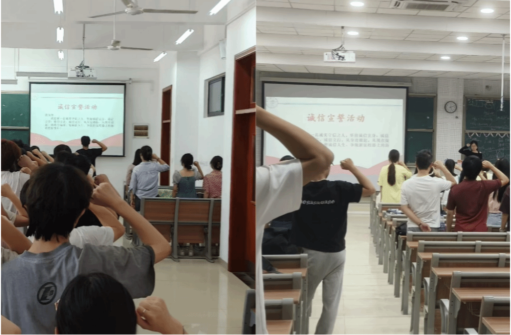 一句誓言铭责任。学院组织各班开展诚信励志宣誓活动,全体学生在辅导员或班长的带领下,以庄重的神情、激昂的语调宣读诚信誓词,用誓言传递对诚信美德的坚守。