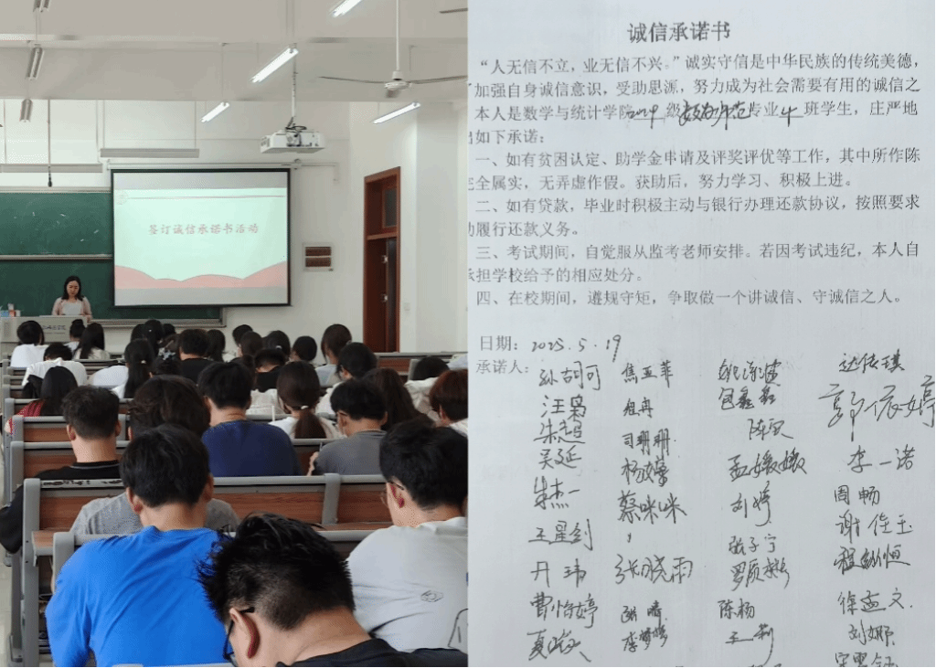一纸承诺践诺言。学院组织全体学生签署诚信承诺书,以文字为证、以行动为诺,将诚信准则内化于心、外化于行,筑牢个人信用基石,共塑学院诚信风尚。