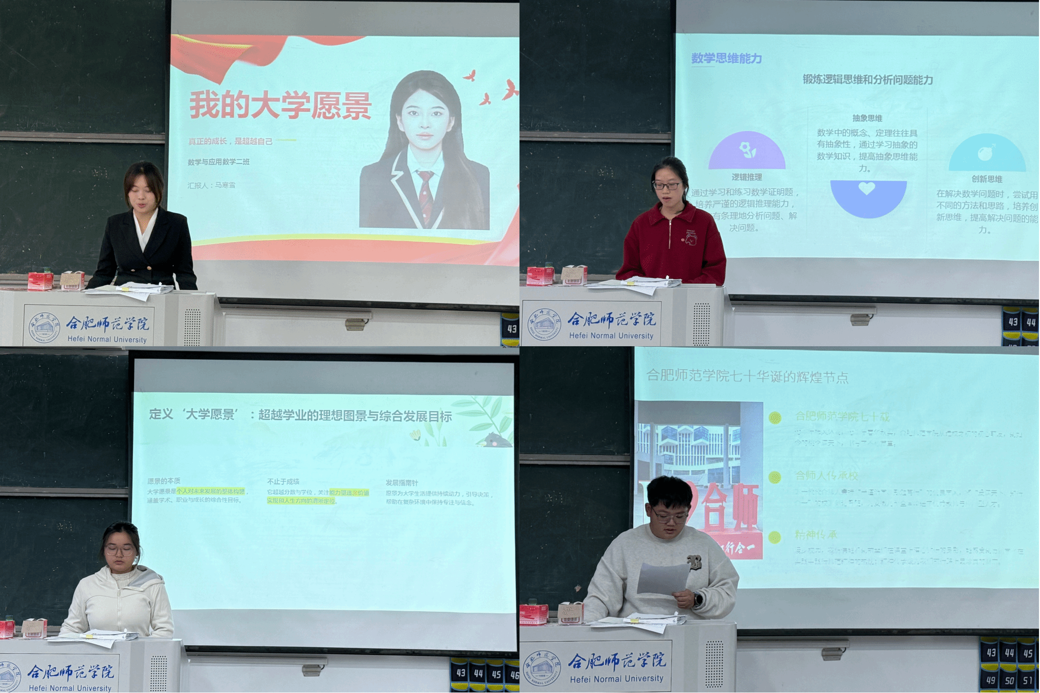 比赛现场,选手们紧扣“我的大学愿景”主题,结合校史底蕴与专业特色,通过精心制作的PPT与富有感染力的演讲,畅谈对大学价值的思考、对成长路径的规划。同学们有的立志深耕数学领域,以扎实学识服务社会;有的畅想投身教育事业,传承师范精神;还有的聚焦综合能力提升,将个人理想融入时代发展洪流……他们或慷慨激昂,或娓娓道来,充分展现了太阳集团tyc33455学子笃行致远的精神风貌与知行合一的追求。现场观众认真聆听,在选手精彩表现时给予掌声鼓励。