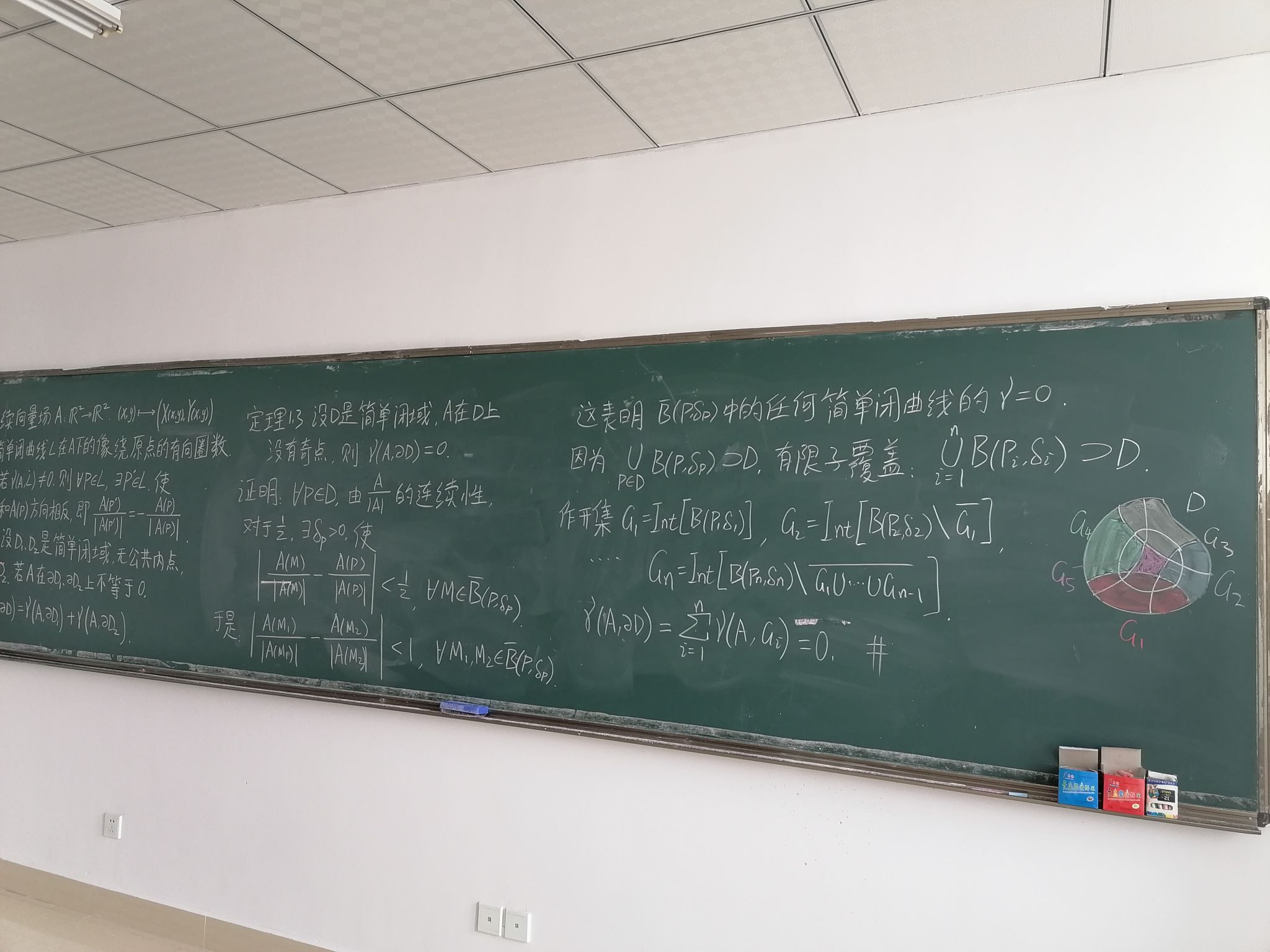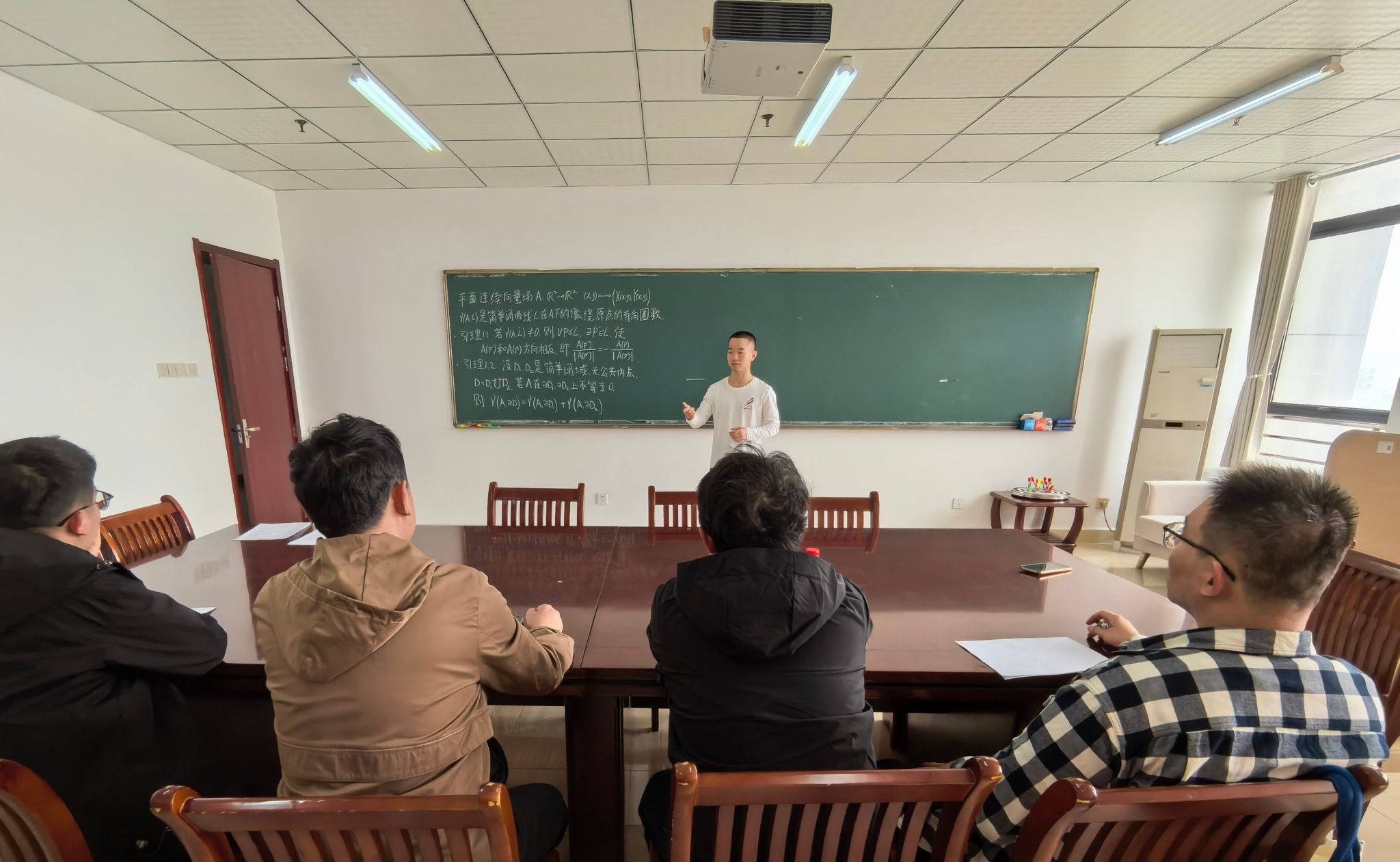 会上,李尧其首先回顾了第一场报告中讲述的旋转数等概念,将其从简单闭曲线推广到有界闭域的边界上,给出了它们的曲线积分表达式,并且重点解释了自然定向和诱导定向的用途。参会教师研究了旋转数关于区域的可加性的证明,对多个细节问题做了详细探讨。最后李尧其用有限覆盖方法证明了,没有奇点的向量场的旋转数为零,这是对此前讨论的多个命题的总结。