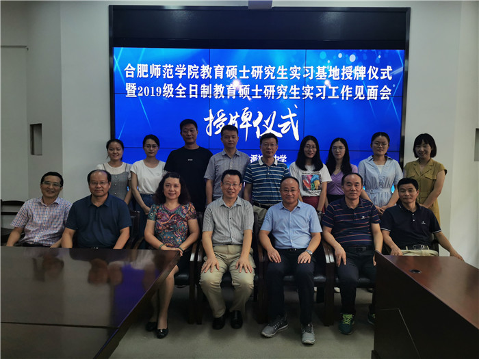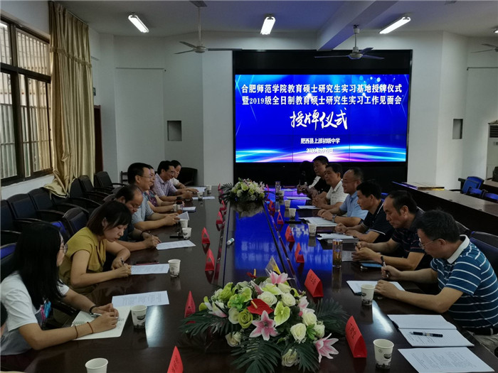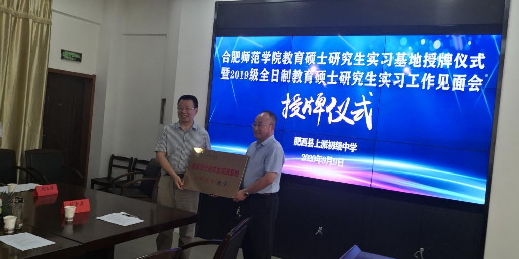 本网讯 2020年9月9日上午9点,太阳成集团tyc33455ccww学科教学(数学)专业硕士研究生实习基地授牌仪式暨2019级全日制研究生实习工作见面会在肥西县上派初级中学2号会议室顺利召开。太阳成集团tyc33455ccww副校长曹卓良、研究生处处长胡玉娟、肥西县上派初级中学校长及党委书记周宁、副校长解光文、教务处主任张世勇、研究生校外导师卫德彬、实习指导教师刘清清、丁增宝、解正兵、孙业勤、太阳集团tyc33455院长王家正、带队教师万家练以及2019级芦琳琳等5位研究生出席并见证了授牌仪式。活动由太阳集团tyc33455院长王家正主持。