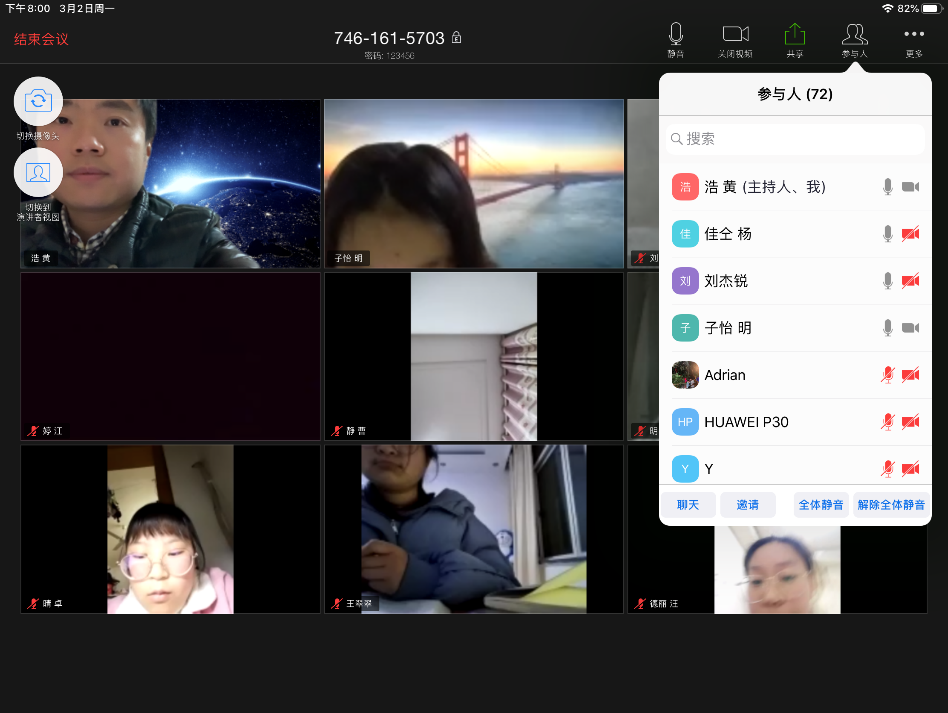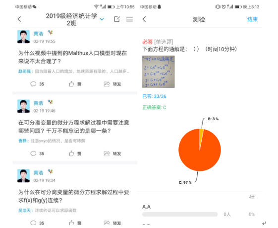 二是创新线上教学方式方法。从学生认知规律和接受特点出发,经过不断地摸索、学习和实践,最终我选定了综合运用ZOOM和学习通两个平台进行直播与互动,再结合数学学科需要较多推理运算的特点,又辅以ipad-Pencil手写功能进行在线板书,基本可以解决师生无法“面对面”的问题,实现线上学习与线下课堂教学实质等效。每次直播前,我会留足时间让学生完成学习通上布置的任务点,引导学生自主学习,基本知识点经过吸收内化后,每位学生再将自己的疑问一一记录下来,提交给学习委员进行汇总分类交给我。直播时,我会先借助ZOOM的屏幕分享功能将电子书和整个板书过程展现给学生,讲解每次课的重难点并答疑,让学生仿佛置身于课堂之中,再利用学习通与同学们互动讨论、测验、提问,以巩固所学知识。通过ZOOM视频可以随时查看每一位同学的实时画面,起到一定的监控作用。每次讨论、测验、提问的问题都是经过精心设计的,以强化学生对每节重难点内容的记忆、理解和应用。直播的效果也得到了同学们的一致好评。