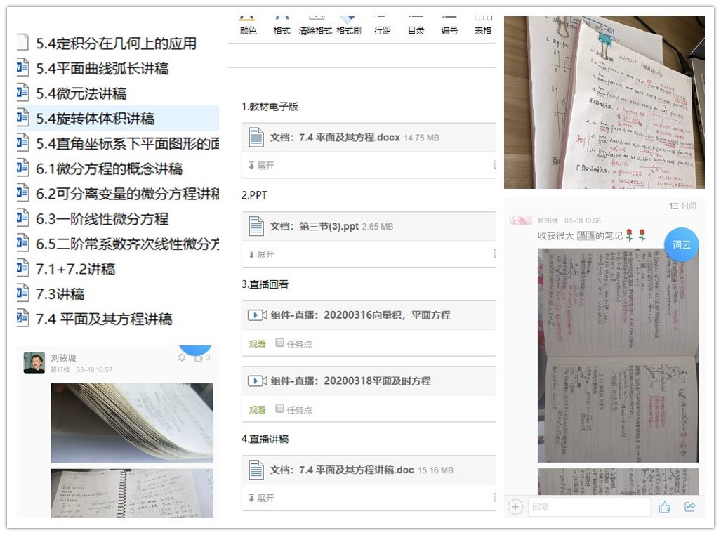 高等数学有很多需要计算及学生练习的内容,为方便学生学习。在直播中我会将所学内容详细写成讲稿,并且每次课后将讲稿整理成电子文档,与直播回放资源一起上传至学习通平台供学生复习巩固使用。在学习通平台建立各章节以“教材电子版+PPT+直播回放+直播授课讲稿”为主的四大教学资源,辅以“测验+作业+问卷+讨论”及时了解并反馈学生疑难知识点,学生的学习任务普遍完成不错。