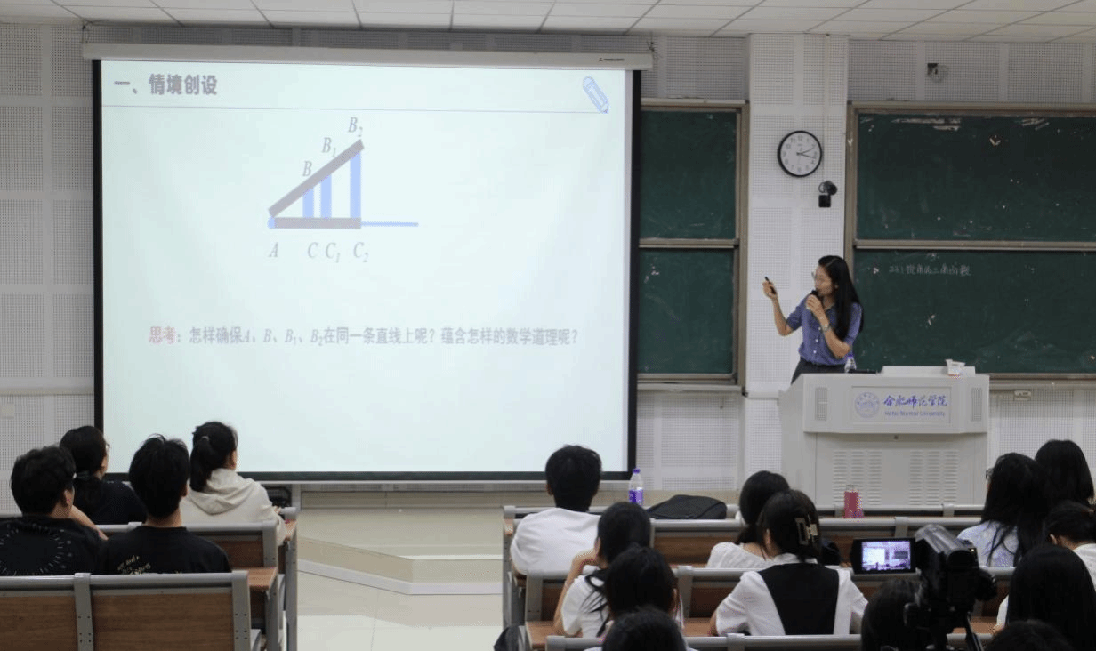 刘清清首先结合自己丰富的一线教学经历和教学竞赛经验,从《义务教育数学课程标准》(2022版)入手,围绕备课标、备教材、备学情、备教师、备教法学法等多个角度分享了如何备好一节课以及如何进行教学设计。随后,她为学生们上了一堂题为“锐角的三角函数”的精彩示范课。这堂课以巧妙的情境引入、亲切的语言表达、流畅的教学过程、精妙的教学设计以及整洁美观的板书,赢得了在场师生们的一致赞誉。