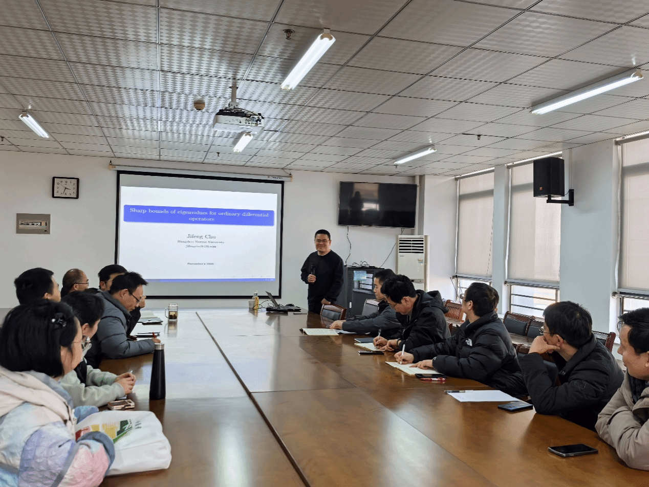 2025年12月8日下午,太阳集团tyc33455在行知楼1102会议室举办微分方程与动力系统学术报告会。杭州师范大学储继峰教授应邀作题为“常微分算子特征值界的锐化性”的学术报告。报告会由太阳集团tyc33455院长杨刘教授主持,学院微分方程与动力系统研究方向的教师参加了本次学术活动。