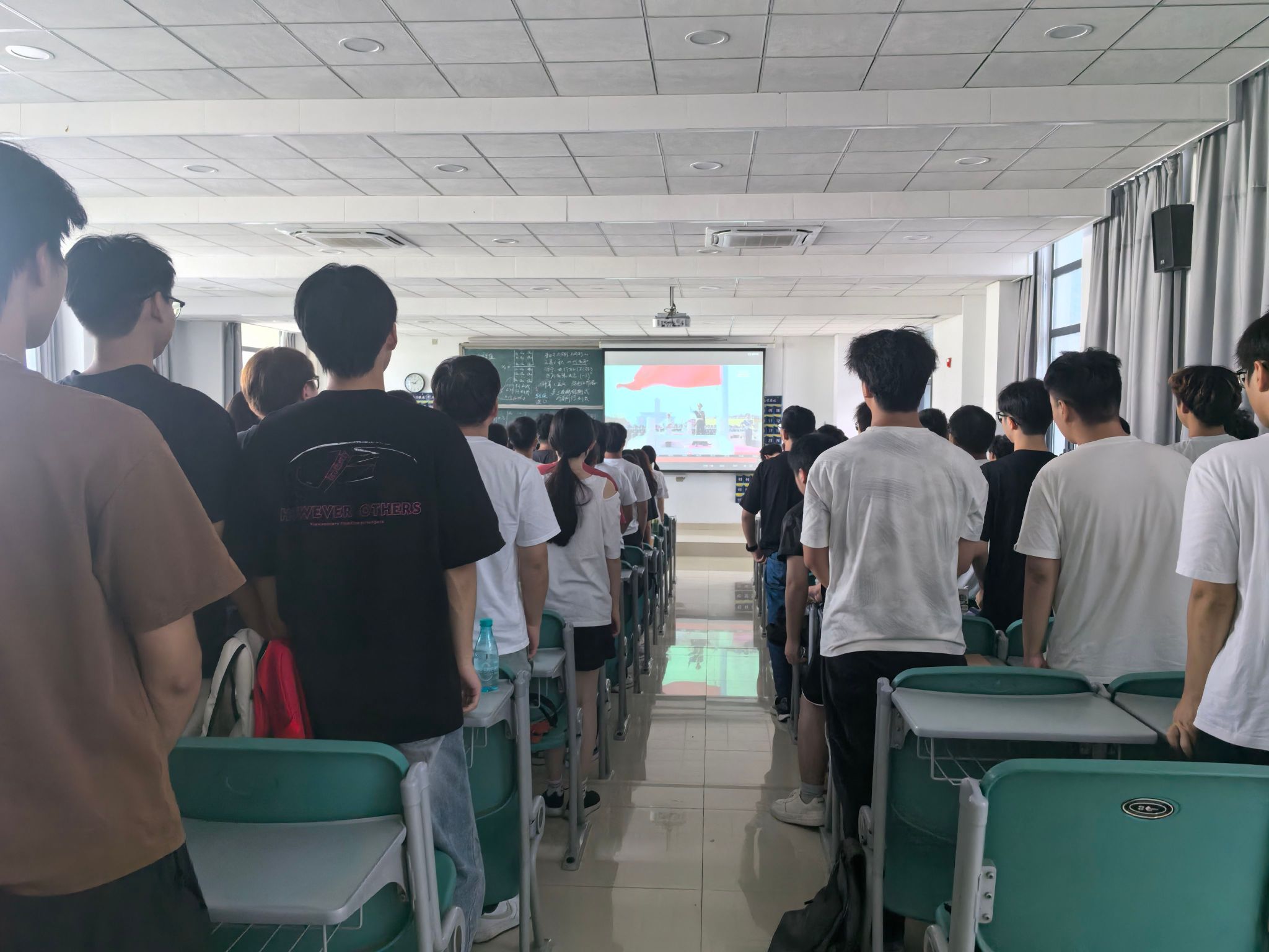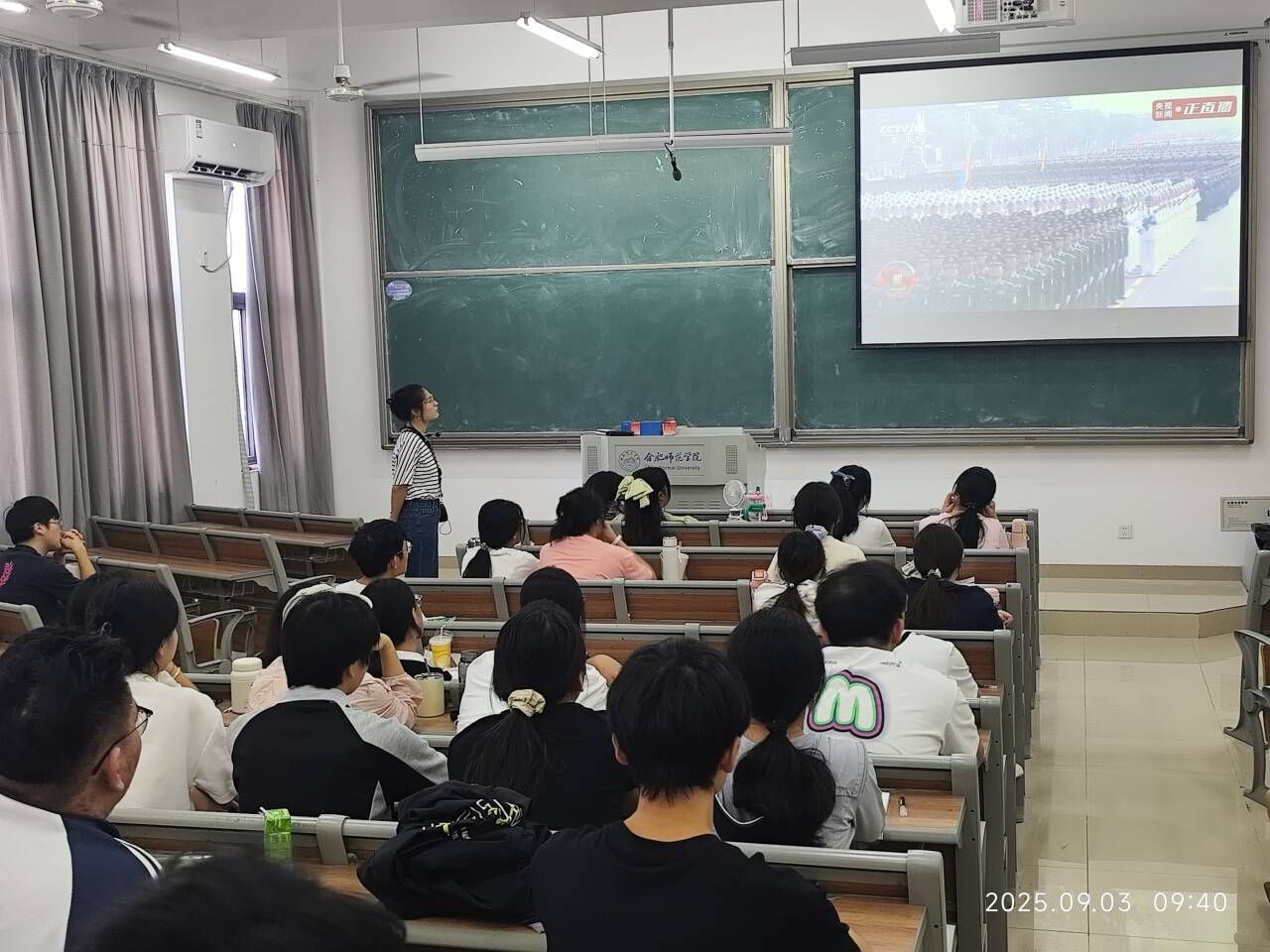 在行知楼1102会议室、教室、宿舍里,师生一起观看,当国歌声响起,全体师生起立齐唱,激昂的旋律在空中回响。收看过程中,习近平总书记在阅兵式上发表的重要讲话激动人心,受阅部队的飒爽军姿和昂扬士气、现代化武器装备的精彩亮相,彰显了中国强大的综合国力和国防实力,引来了大家的阵阵赞叹。