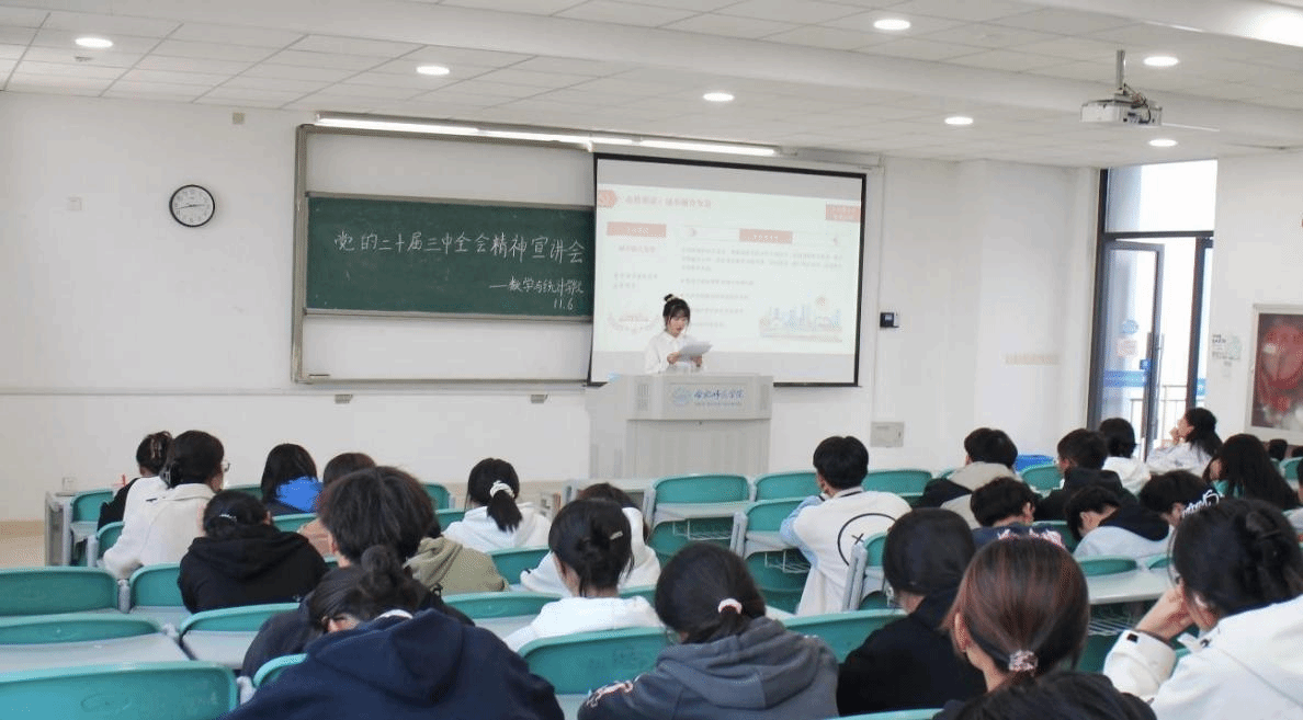 为深入学习宣传贯彻党的二十大和二十届三中全会精神, 11月6日,太阳集团tyc33455在滨湖校区博学楼C201开展了党的二十届三中全会精神青年学生宣讲会,会议邀请了校第四届青年学生宣讲团成员李康焱宣讲。共青团太阳集团tyc33455委员会、太阳集团tyc33455学生会、团支部等滨湖校区成员及共青团员,近120余人参会。
