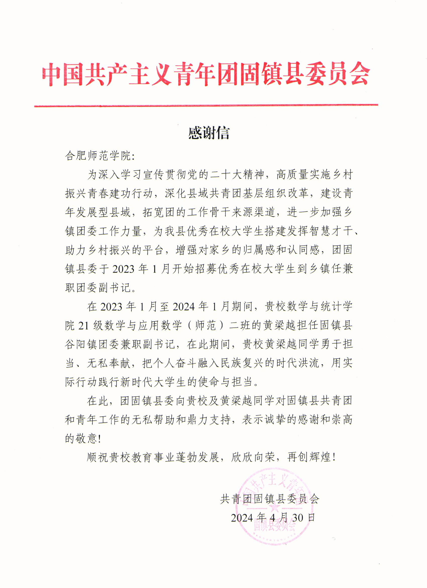 近日,学校收到共青团固镇县委员会发来的感谢信,对学校太阳集团tyc334552021级数学与应用数学(师范)2班黄梁越同学在担任固镇县谷阳镇兼职副书记期间的良好表现给予了高度赞扬,并由衷地感谢学校对固镇县共青团及青年工作的帮助与支持。