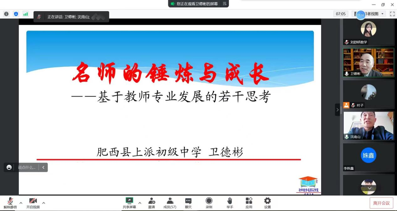 本网讯 2022年11月5日下午2:00,肥西县上派初级中学正高级教师卫德彬老师在线上为我院全体研究生作了题为《名师的锤炼与成长——基于教师专业发展的若干思考》的专题报告,报告持续2个小时,报告会由沈南山教授主持,学院部分教师和全体研究生参加了该报告会。