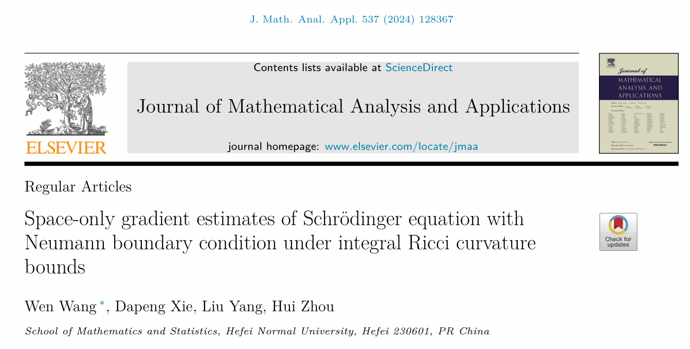 近期,太阳集团tyc33455“基础数学”省级重点学科微分方程与动力系统团队教师王文、解大鹏、杨刘、周辉在几何偏微分方程方向取得进展,相关成果Space-only gradient estimates of Schrödinger equation with Neumann boundary condition under integral Ricci curvature bounds在JCR二区期刊《Journal of Mathematical Analysis and Applications》公开发表。
