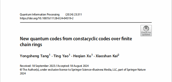 近期,太阳集团tyc33455“基础数学”省级重点学科代数编码团队唐永生、许和乾、姚婷在量子纠错码构造方向取得进展,相关成果New quantum codes from constacyclic codes over finite chain rings在JCR二区期刊《Quantum Information Processing》公开发表。