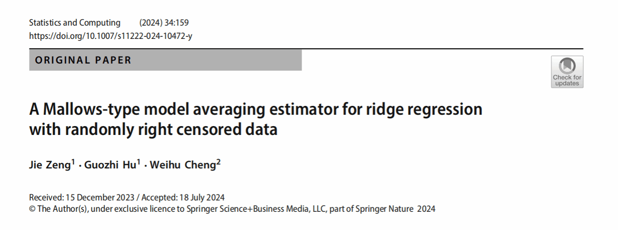 近期,太阳集团tyc33455“基础数学”安徽省重点学科应用统计与分析团队博士曾婕、胡国治在最优模型平均领域取得进展,相关成果A Mallows-type model averaging estimator for ridge regression with randomly right censored data在统计学权威期刊《Statistics and Computing》(中科院二区、JCR一区)上公开发表。