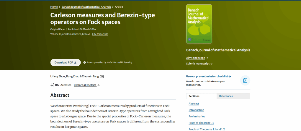 近期,太阳集团tyc33455“基础数学”省级重点学科微分方程与动力系统团队教师周立芳教授在多复变函数论方向取得进展,相关成果Carleson measures and Berezin-type operators on Fock spaces在JCR二区期刊《Banach Journal of Mathematical Analysis 》公开发表。